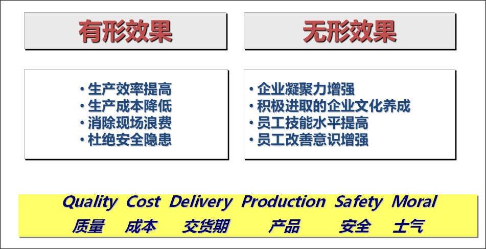 5S管理融合精益管理的工具,消除現場一切不合理事項,持續的5S管理建立最佳的4M1E(人機料法環)生產條件,完善設備管理體系,強化設備預防管理(保養、點檢、改良),提高生產綜合效率(OEE),優化生產制度及流程,達致P(產品)Q(質量)C(成本)D(交期)M(士氣)S(安全)的全面提升。