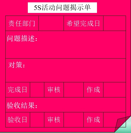 (二)紅牌作戰(zhàn):使用紅牌子,使工作人員都能一目瞭然地知道工廠的缺點(diǎn)在那里的整理方式,而貼紅單的對象,包括庫存、機(jī)器、設(shè)備及空間,使各級(jí)主管都能一眼看出什麼東西是必須品,什麼東西是多馀的。