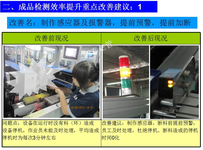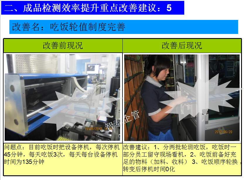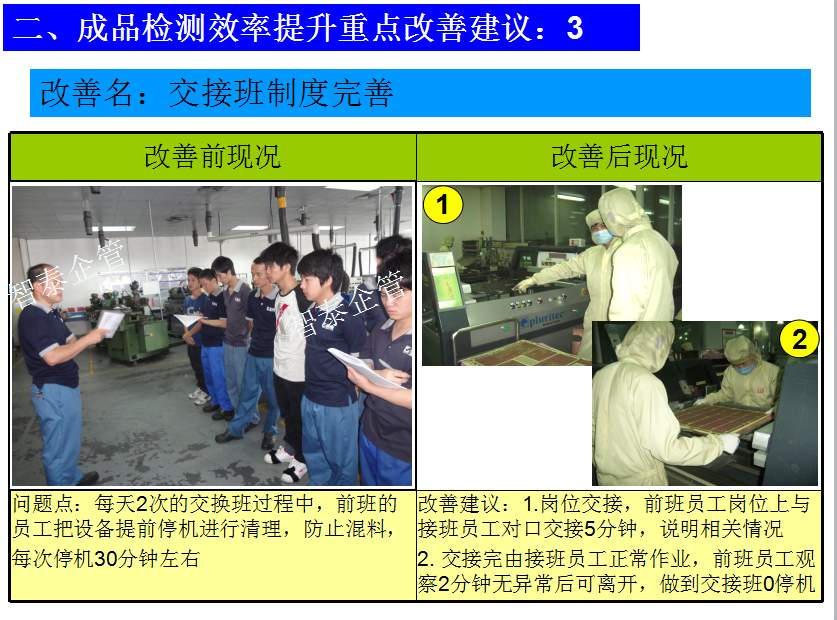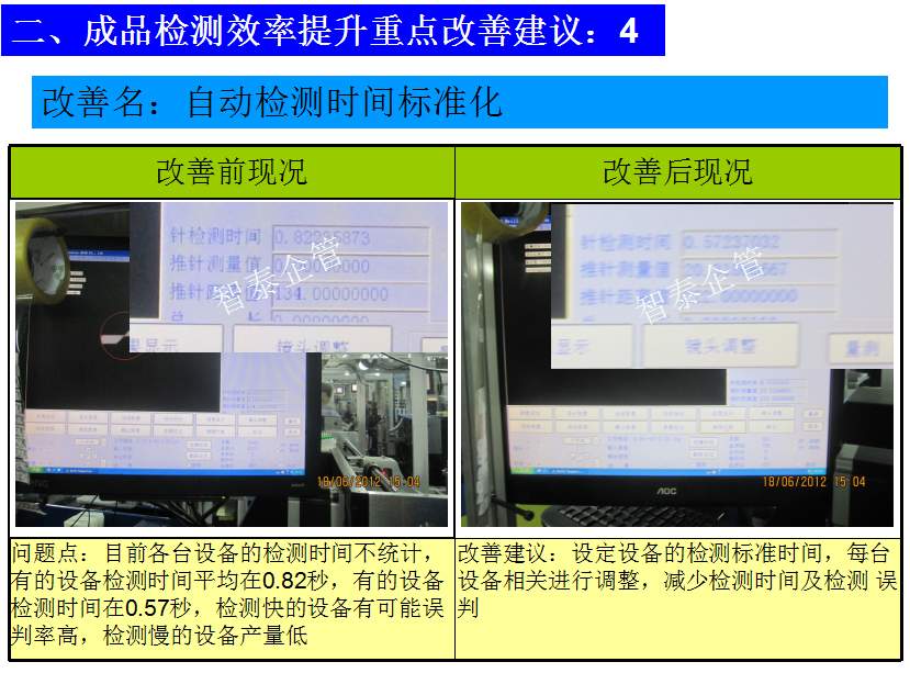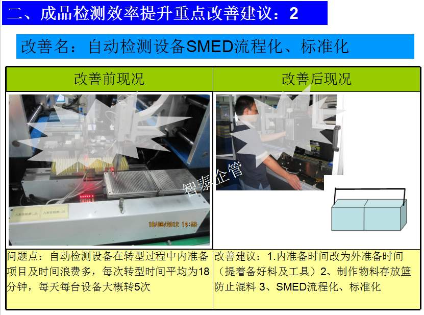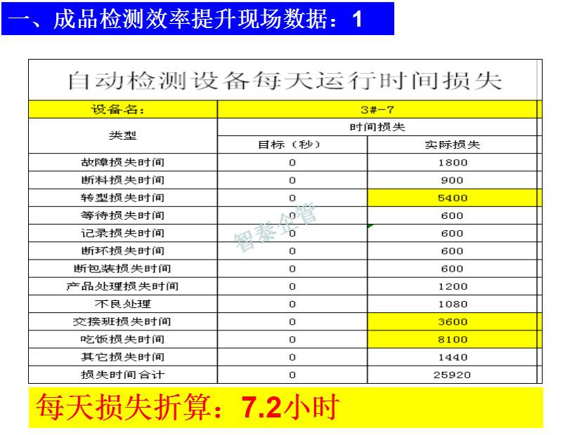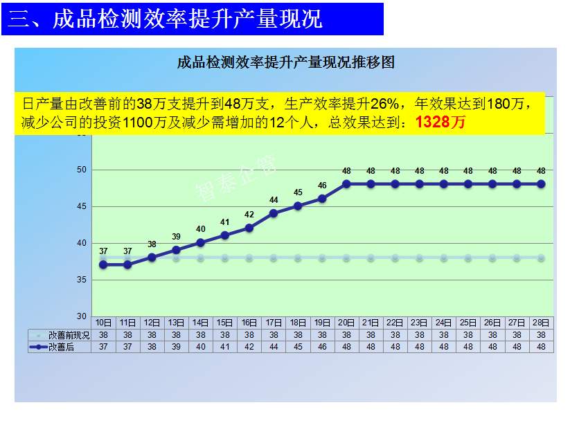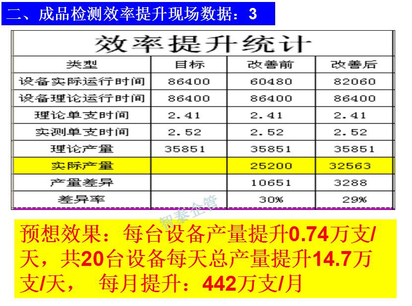 世界級制造及精益管理是智泰人一生追求的理想,智泰咨詢在企業推進精益生產后平均生產效率提升35%以上,智泰專業團隊為企業消除八大浪費,通過精益管理,提高企業的生產效率和產品質量,持續推進焦點課題改進重大問題,每年給企業帶來的收益平均有800萬以上,附件為智泰咨詢顧問團隊為某企業生產效率提升的案例,請查閱: