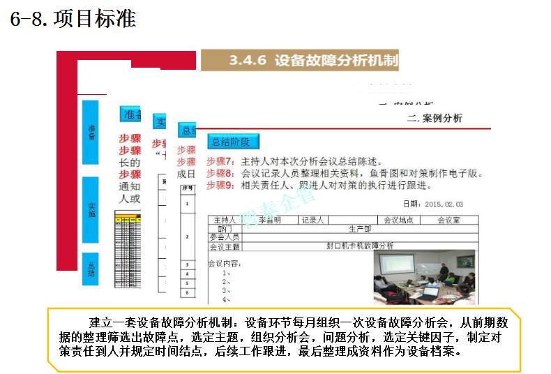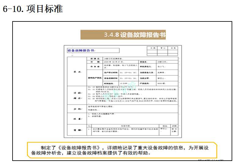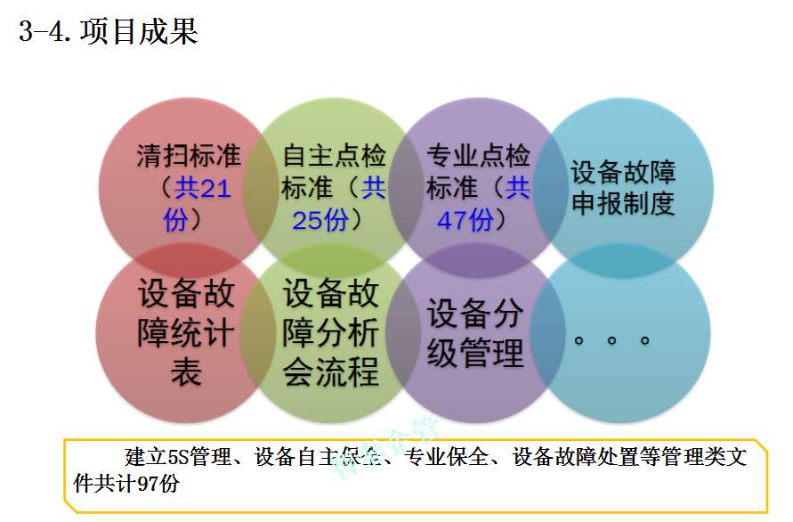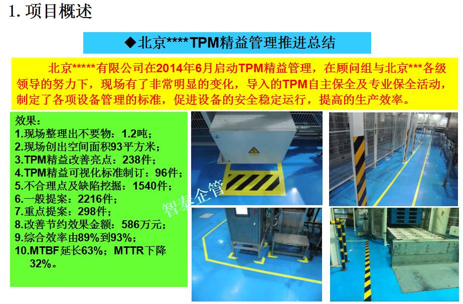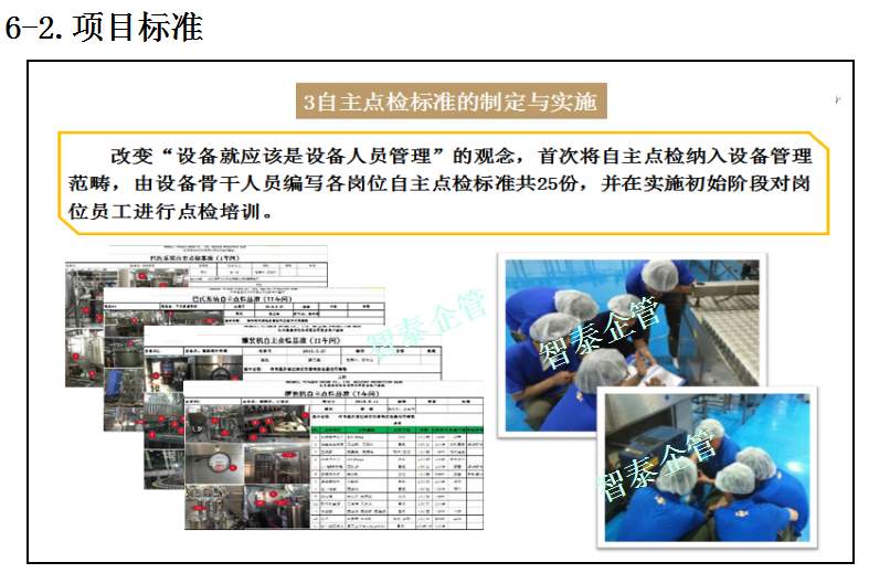 智泰咨詢下屬的TPM咨詢公司為企業推進的TPM管理活動中,為企業設備故障率下降推進了大量的制度及標準,通過TPM全員參與活動,消除設備的缺陷并改善及復原,并對設備進行部分改良,促進設備長期穩定運行,提高設備生產綜合效率,附件為智泰咨詢專業團隊在某企業推進的TPM管理實錄,請查閱: