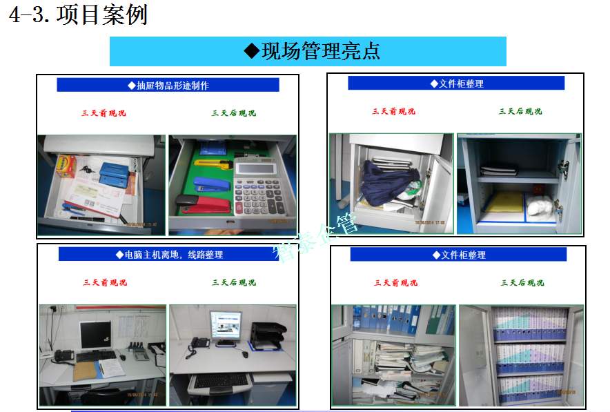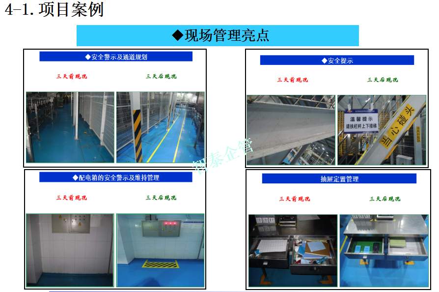 智泰咨詢下屬的5S管理公司首創的產品三天一標桿,三天一條線,三天締造6~8個標桿車間,智泰咨詢專業的顧問團隊為企業的5S管理快速打造已形成一套標準化內容。