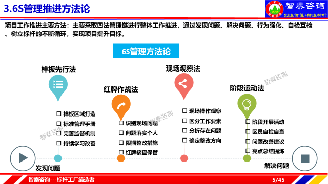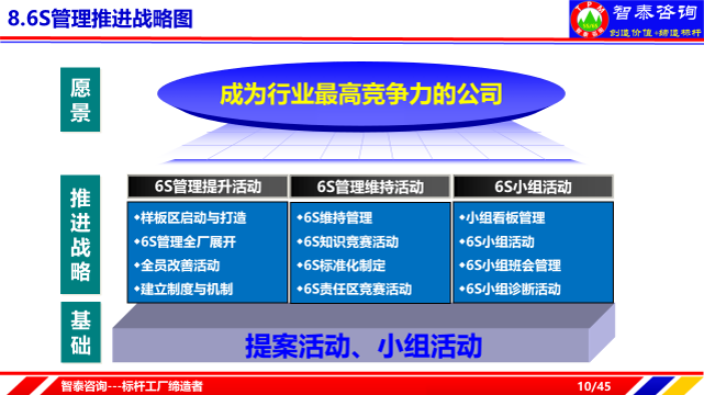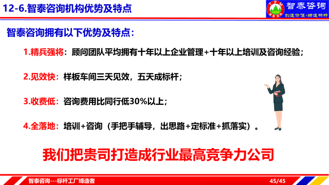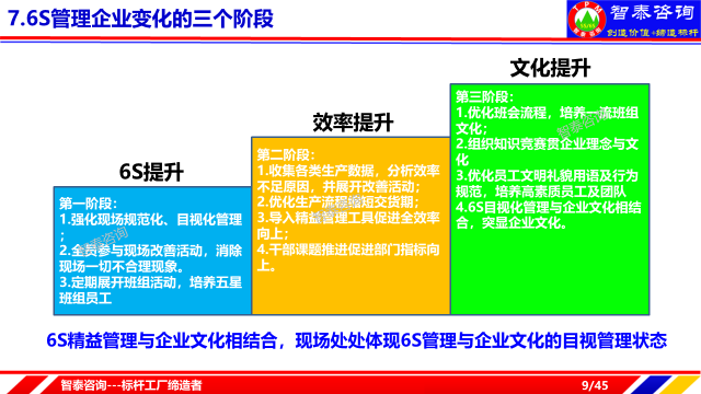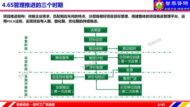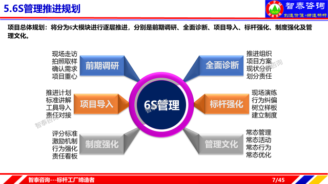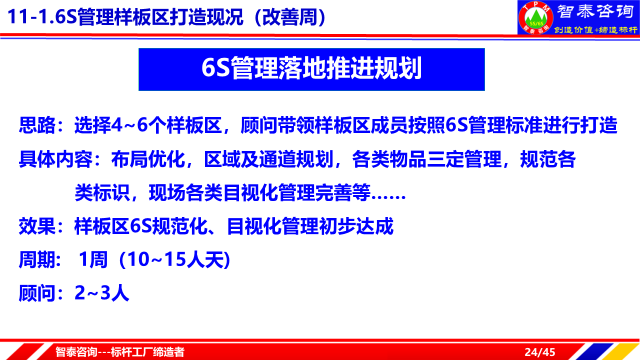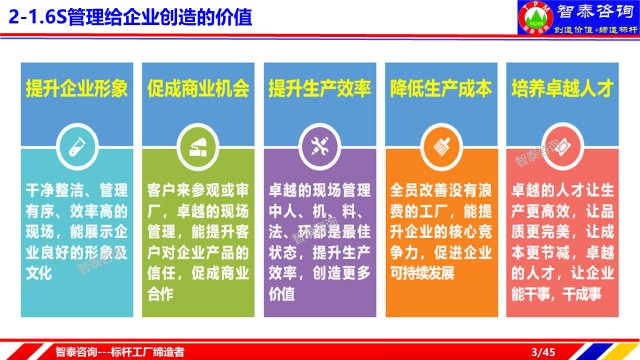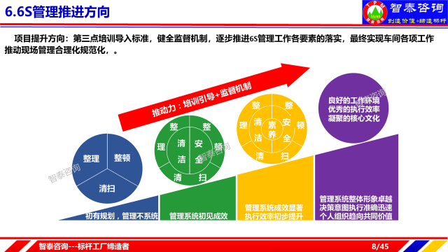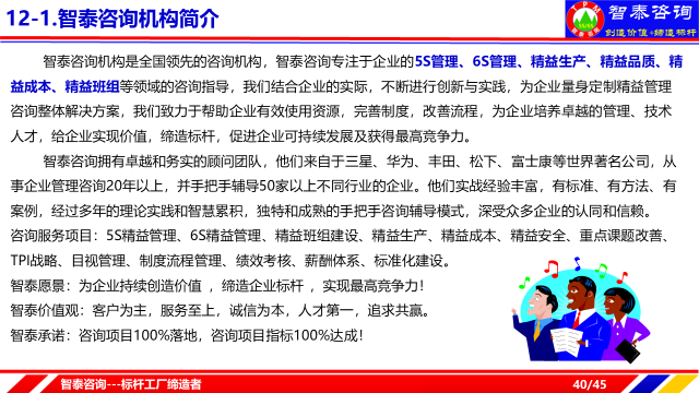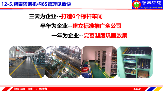 智泰咨詢公司給企業提供專業的5S管理,6S管理,TPM管理落地輔導與培訓服務;給企業提供免費上門調研服務,給企業免費提供5S,6S管理,TPM管理定制化落地輔導方案。