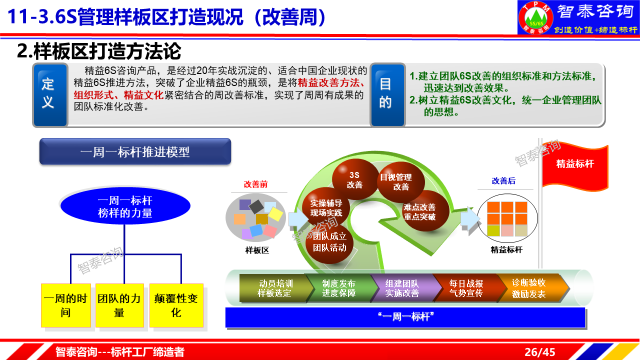 智泰咨詢下屬的5S管理公司首創的產品三天一標桿,三天一條線,三天締造6~8個標桿車間,智泰咨詢專業的顧問團隊為企業的5S管理快速打造已形成一套標準化內容。
