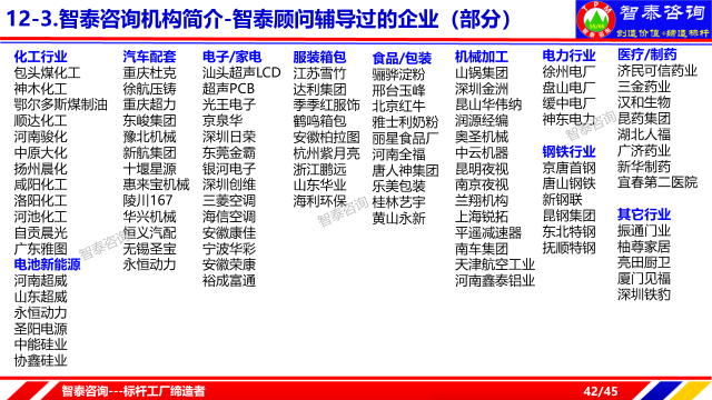 智泰顧問均來自于三星、華為、豐田、松下、富士康等世界著名公司,并有20年及30家以上企業的咨詢經驗及成功案例。他們實戰經驗豐富,有標準、有方法、有案例,經過多年的理論實踐和智慧累積,深受眾多企業的認同和信賴,追求與客戶共贏的核心價值觀去服務好每一家客戶。