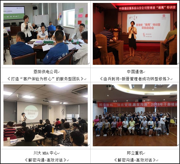 為通訊行業(yè)培養(yǎng)1000余名優(yōu)質(zhì)員工及管理者:多次應邀為四川移動、成都移動、四川電信、成都電信、四川通信服務公司、涼山通信服務公司等進行《習贏職場-高效能人士的七把金鑰匙》、《由兵到將-新晉管理者成功轉(zhuǎn)型修煉》、《新員工職業(yè)化和服務營銷》等課程培訓,為通訊行業(yè)培養(yǎng)1000余名優(yōu)質(zhì)員工及管理者,客戶滿意度達94%以上。