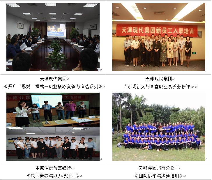 ● 人才梯隊精準打造:曾為天津現代集團,中德住房儲蓄銀行建立并逐步完善集團培訓體系,針對基層員工、中高層管理者等開發相應的職場效能培訓項目并予以實施,打造并提升員工的職業競爭力,參訓人次達到4000+,更是針對企業實際情況,進行內部講師體系設計,并為企業輸送內部講師百余人。