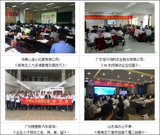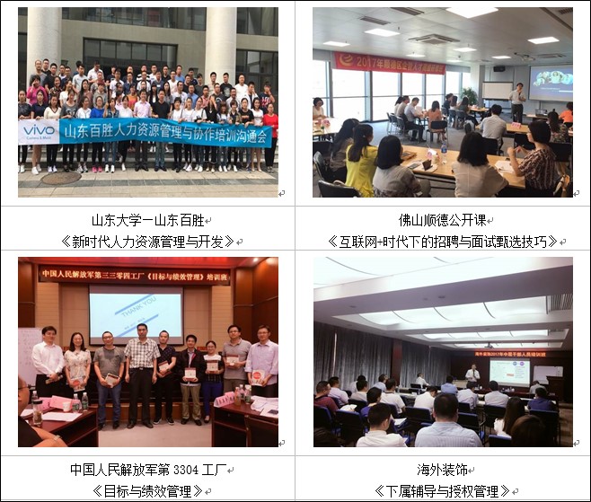 楊老師服務(wù)的客戶遍布北京、天津、上海、深圳、廣州、成都、南京、杭州、武漢、鄭州、沈陽、哈爾濱、長春、長沙、西藏、蘭州、銀川、福州等地200以上企業(yè),為中核工業(yè)集團(tuán)、三星中國、中國移動(dòng)、中國電信、中國聯(lián)通、中鐵建工集團(tuán)、中國重汽、美的集團(tuán)、中國郵政、中國郵儲(chǔ)、中通通訊、中國建設(shè)銀行、中國工商銀行、中國農(nóng)業(yè)銀行、中信銀行、柳工集團(tuán)、陽光保險(xiǎn)、華美集團(tuán)、中通通訊、惠豐機(jī)電、建滔化工集團(tuán)、金威啤酒集團(tuán)、富士康集團(tuán)、美的集團(tuán)、巴士集團(tuán)、重慶電工、遵義卷煙、共進(jìn)電子、廣州恒大集團(tuán)、廣州粒上皇食品、廣西路橋集團(tuán)、河南心連心化肥、南寧威寧投資集團(tuán)、南沙海城貨代、順豐快遞、廣東省各地人才交流中心、清華大學(xué)國際MBA教學(xué)中心、武漢大學(xué)干部培訓(xùn)中心、華中科技大學(xué)MBA教學(xué)中心、華東理工大學(xué)培訓(xùn)中心、蘭州大學(xué)研究生院、河北工業(yè)大學(xué)、廈門大學(xué)、上海交通大學(xué)、西南交通大學(xué)干部培訓(xùn)中心等多家高校EMBA班授課和多家大中型企事業(yè)單位進(jìn)行中、高層領(lǐng)導(dǎo)加力與管理技能、人力資源管理技能及職業(yè)素養(yǎng)提升、陽光心態(tài)培訓(xùn)超700余場(chǎng)次。