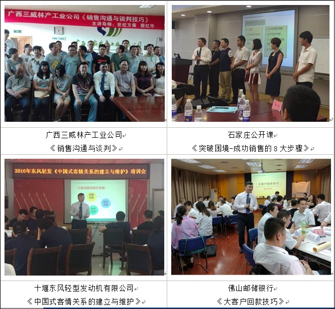 黎老師24年的營銷管理和培訓生涯,積累了豐富的企業管理實戰和顧問經驗,授課方式新穎獨特,重視與學員間的互動、交流來啟發學員,使學員在視覺、聽覺、觸覺、思維模式上形成多方位的感受,從而使之產生體驗;并將理論與實戰、認知與實踐相結合,重視激發學員思維內在視角,啟迪團隊靈性及感悟智慧,其博取眾長,形象生動的授課風格,幽默和極富感染的表達力,營造了一個個活潑有趣的培訓課堂,充分激發了學員的潛能,使參訓者的專業知識和技能在較短的培訓時間內得到了升華,深受客戶的歡迎和好評。