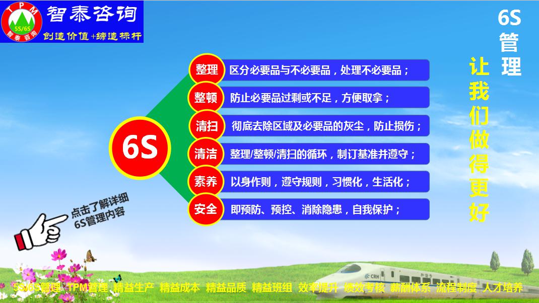 目前我們大眾所了解的6S管理是一種企業的基礎管理模式,是企業5S管理的升級版,6S管理即是整理(SEIRI),整頓(SEITON),清掃(SEISO),清潔(SEIKETSU),素養(SHITSUKE),安全(SECURITY)。6S和5S管理一樣最早興起于日本企業,現已流行于全世界的企業,6S管理做好優秀企業必須進行的一種管理方法,但不僅要求改變企業的環境,也提高了企業的效率,質量,安全,士氣,也降低了企業的生產成本,縮短企業的產品的交貨期,可以這么說,6S管理能全面提升企業綜合競爭力。